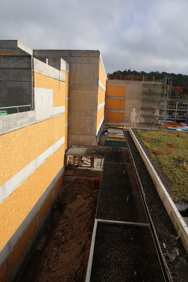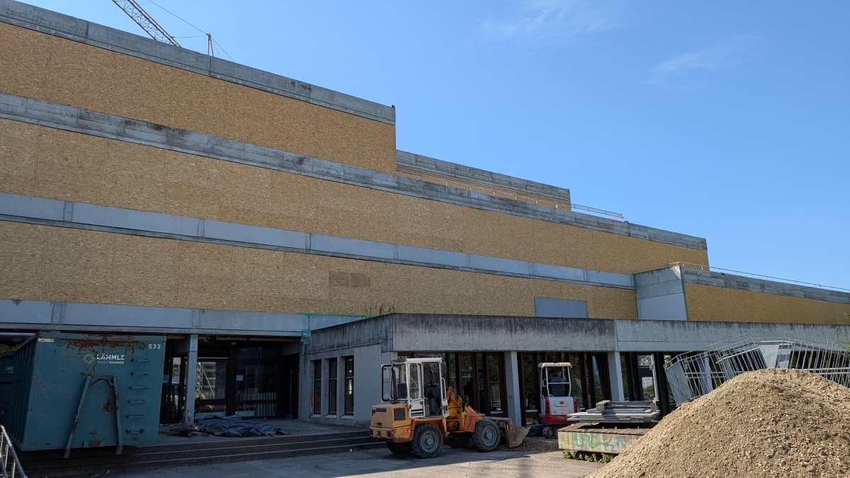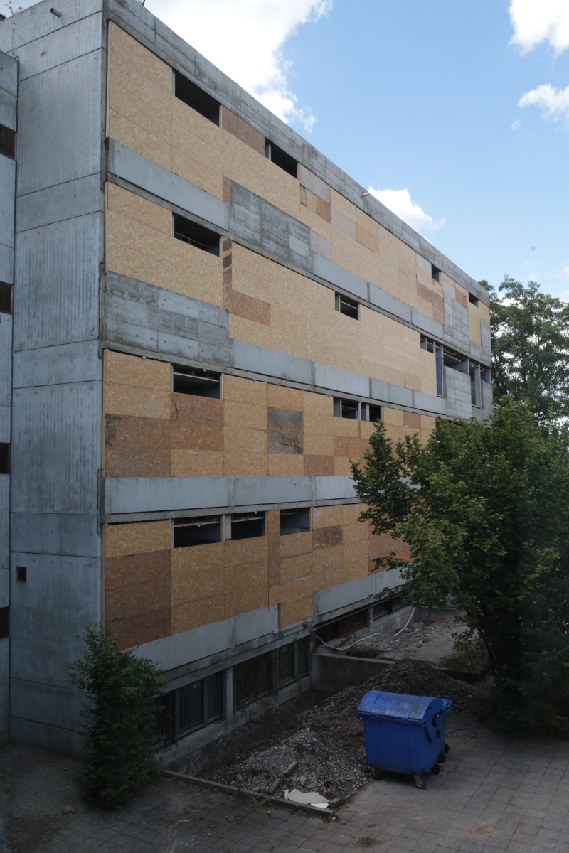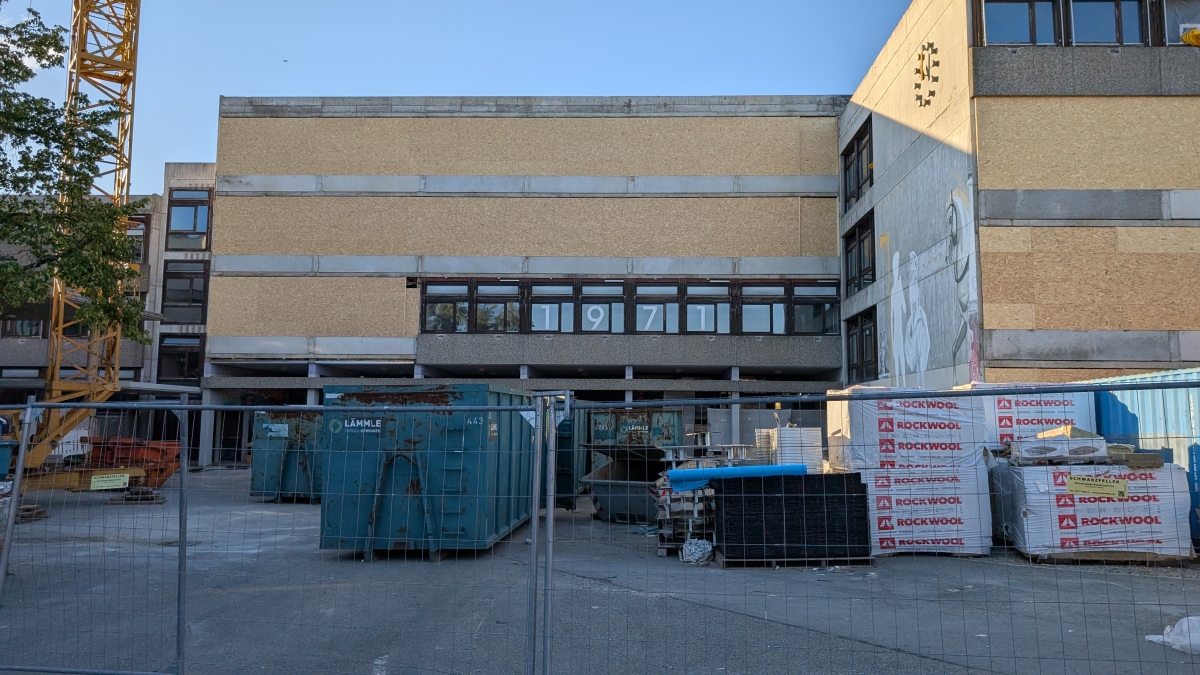 Kurz vor den Sommerferien wurden am alten Gebäude die Fenster ausgebaut und die Waschbetonplatten entfernt. Stattdessen wurden die entstandenen Löcher mit MDF-Platten verschlossen, so dass die Bauarbeiter seither bei künstlichem Licht arbeiten müssen.