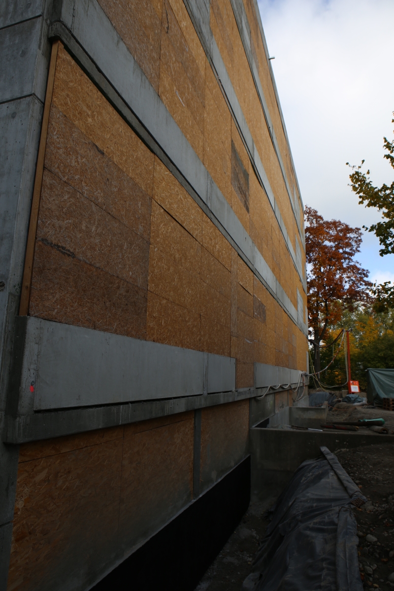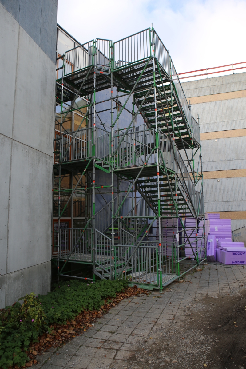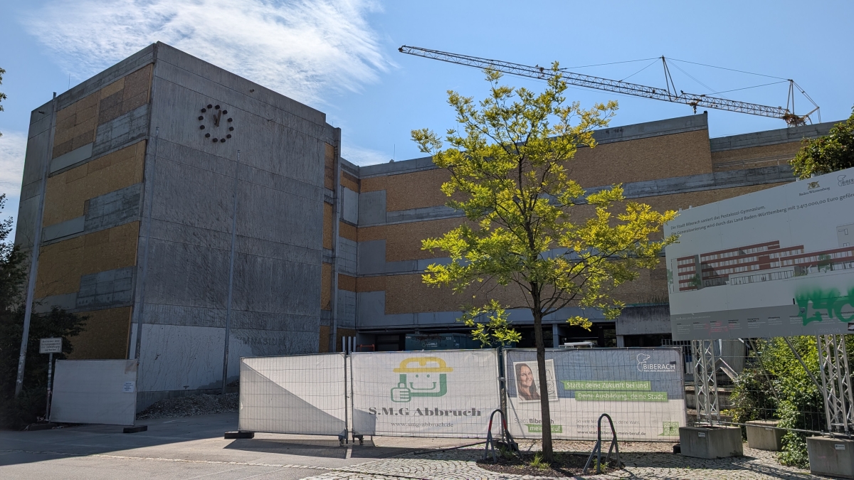 Kurz vor den Sommerferien wurden am alten Gebäude die Fenster ausgebaut und die Waschbetonplatten entfernt. Stattdessen wurden die entstandenen Löcher mit MDF-Platten verschlossen, so dass die Bauarbeiter seither bei künstlichem Licht arbeiten müssen.