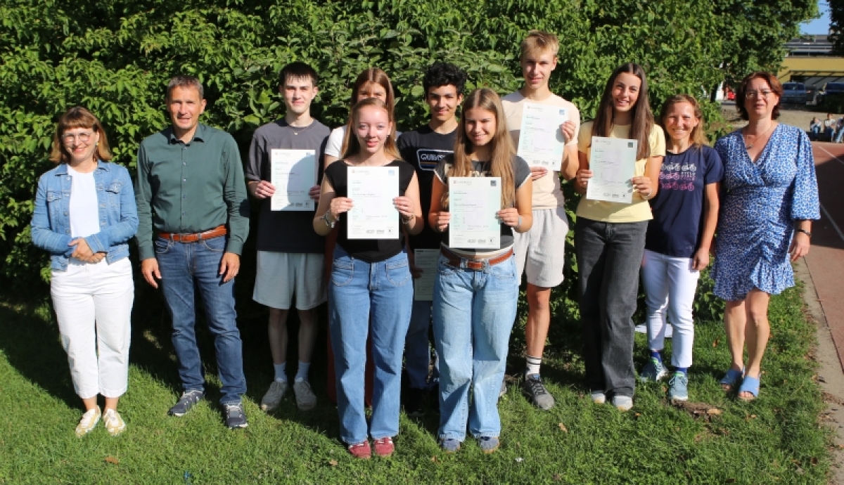 Fremdsprachen eröffnen den Schülerinnen und Schülern neue Horizonte und qualifizieren sie für ihre weitere Laufbahn in Ausbildung und Beruf. Dazu gibt es am Pestalozzi-Gymnasium die Möglichkeit, am Ende der zehnten Klasse eine international anerkannte Sprachprüfung abzulegen, wie hier im Bild die erfolgreichen Absolventen mit ihrem „Cambridge First Certificate in English“. Auch die französische Sprachprüfung DELF sowie das spanische Dele Zertifikat werden erworben.