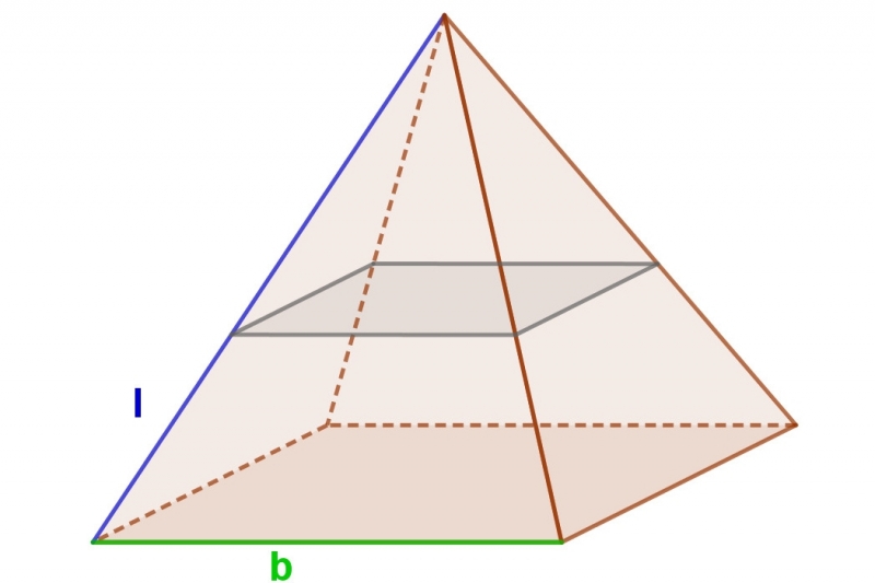 Die Grundfläche einer senkrechten quadratischen Pyramide ist b=14 m lang. Die Pyramide wird parallel zur Grundfläche in zwei Teile geteilt, so dass ein Pyramidenstumpf und eine kleinere Pyramide darüber entsteht. Die Länge der Seitenkanten l des Pyramidenstumpfs beträgt 10,5 m. Die Oberseite des Pyramidenstumpfs ist ein Quadrat mit Seitenlänge 8 m. Bestimme bei der kleinen oberen Pyramide die Kantenlänge (von der Schnittfläche zur Spitze).