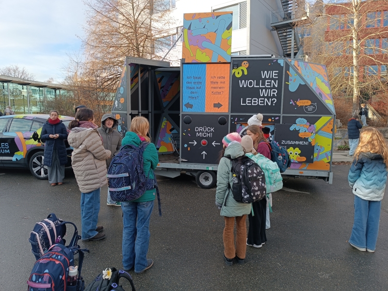 „Die Zukunft beginnt hier!“ steht auf dem farbenfrohen Anhänger des mobilen Futuriums. Eine Woche lang entwickelten die Schülerinnen und Schüler des PGs zusammen mit dem Team des mobilen Futurium aus Berlin Zukunftsvisionen für die Bereiche Ernährung, Mobilität und Arbeitswelt.
