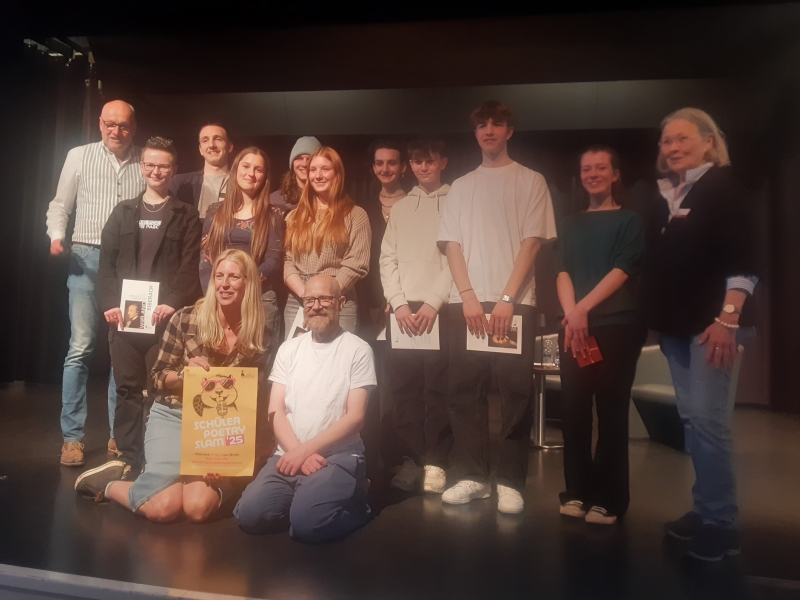 Mit ihren eleganten, empfindsamen und ehrlichen Texten über das Erwachsenwerden und ihre Schwestern konnte Sophie Fuß das Publikum für sich gewinnen. Mit tosendem Applaus wurden ebenfalls die schonungslose Abrechnung mit Stress & Hektik von Luna Haushalter (J2) gefeiert. Den schulinternen Poetry Slam-Workshop leiteten Alex Wind und Thomas Büttner … und nicht nur von ihnen wurde Zoé Sandel (J2) mit ihrem Text „Ich hasse Zahlen“ vermisst, da ihr Platz auf der Bühne krankheitsbedingt frei blieb. Aber dafür durften die Zuschauer nochmal Leia Weiss (Abi 2024 und Siegerin 3. Schüler-Slams) am Mikrofon erleben.