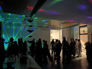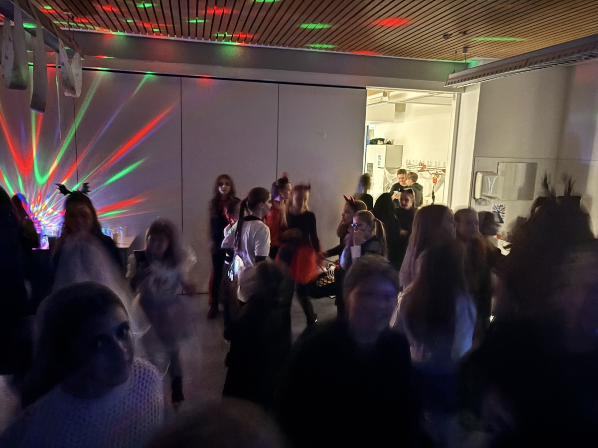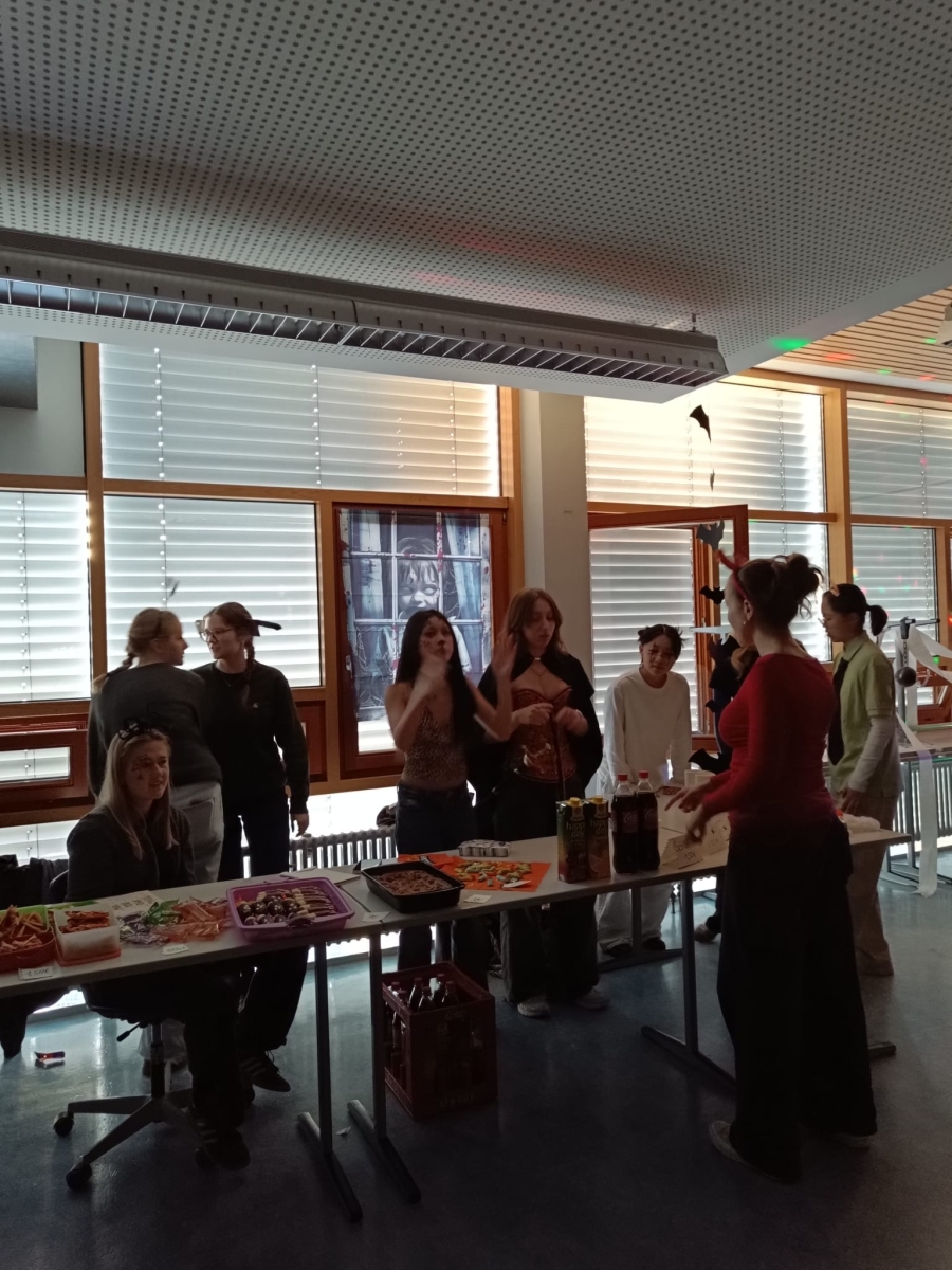 Dafür wurden ab 16 Uhr die Klassenzimmer im 2. Stock des L-Baus gruselig geschmückt und in Partyräume umgewandelt. Von 17.30 bis 20 Uhr feierten dann etwa 50 Schülerinnen und Schüler und Lehrer gemeinsam bei ausgelassener Stimmung: Es wurde viel getanzt, Partyspiele veranstaltet und die Gewinner des Kostümwettbewerbs gewählt. Für den kleinen Hunger und Durst verkaufte die J2 noch Getränke und Snacks im Halloween-Stil.