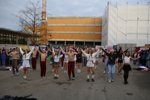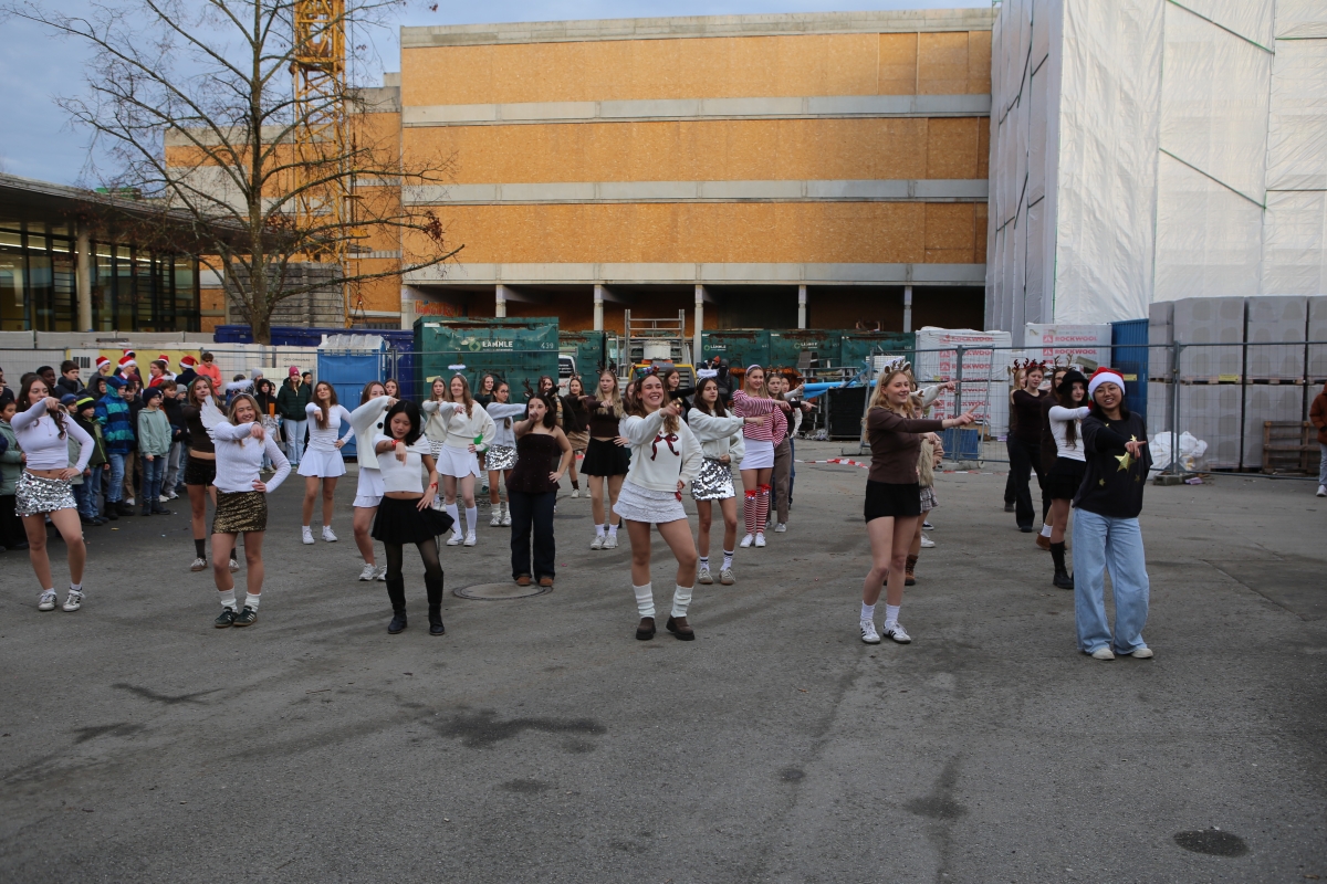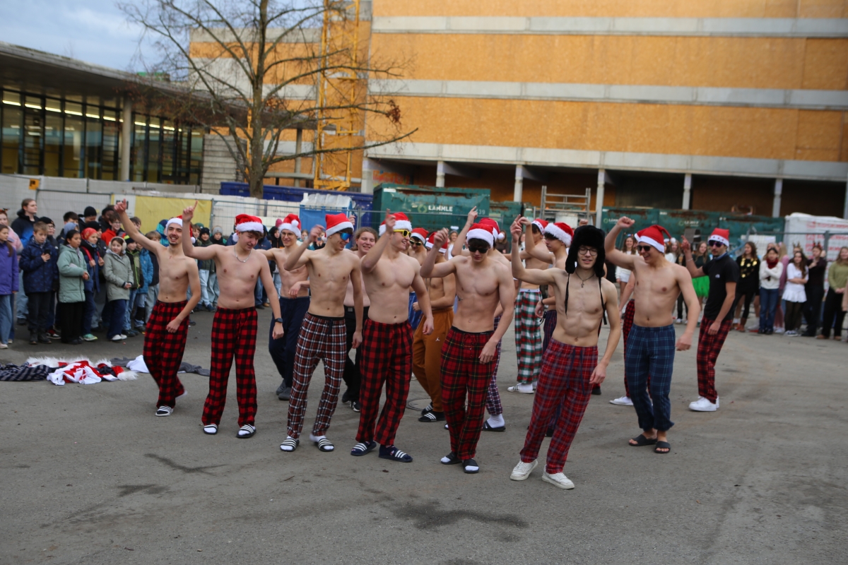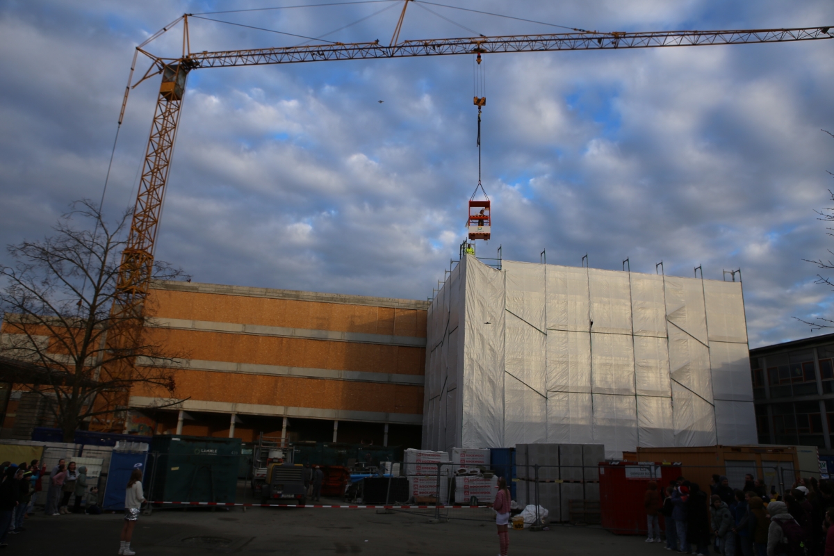 Die Renvierung unserer Schule hat es nötig gemacht, nach Alternativen für das Christkindle ralassa an der Fassade zu suchen. Fündig wurden die 12er im Baukran auf dem Südhof. Unter den fachkundigen Augen der Bauarbeiter wurde das Christkindle Emily Nowak hochgezogen und schwebte in unerreichbaren Höhen in einem Personentragekorb über der Schulgemeinschaft.