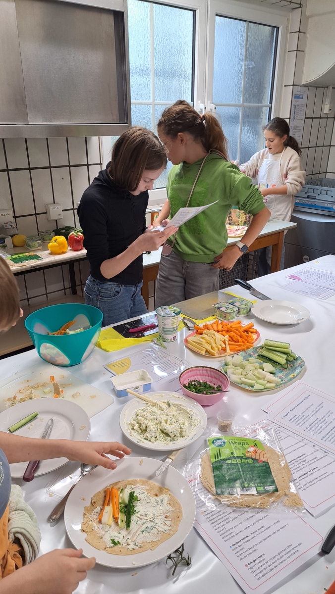 Ein besonderes Highlight der AG waren die Praxisnachmittage in der Küche. Hier bereiteten die Schülerinnen und Schüler gemeinsam gesunde Snacks, Dips, Salate und weihnachtliche Leckereien zu. Dabei standen Hygiene, sicheres Arbeiten und Teamarbeit ebenso im Fokus wie der Spaß am gemeinsamen Zubereiten und Probieren.