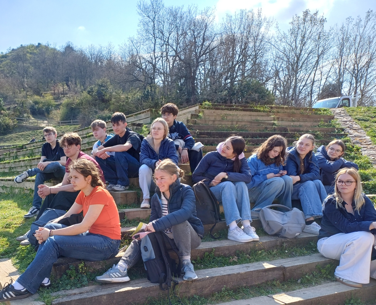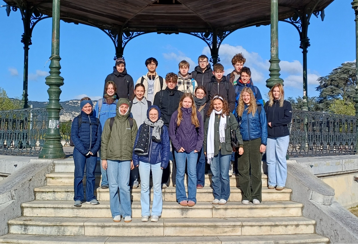 Nach der Ankunft am Samstagabend verbrachten wir alle einen – für Südfrankreich eher unüblich – leicht verregneten Sonntag in unseren Gastfamilien. Pünktlich zum offiziellen Programmstart am Montag besserte sich das Wetter, sodass wir nachmittags bei strahlendem Sonnenschein zur nahegelegenen Burgruine Crussol wandern und die Aussicht über das weite Rhônetal genießen konnten. Zuvor stand jedoch der Schulalltag im Fokus: Nach einer Hospitation im Unterricht besuchten wir eine von französischen Schülern gestaltete Ausstellung zum Elysée-Vertrag, welche die Bedeutung der deutsch-französischen Freundschaft – mit Schwerpunkt auf der lebendigen Freundschaft zwischen Valence und Biberach – anschaulich darstellte.